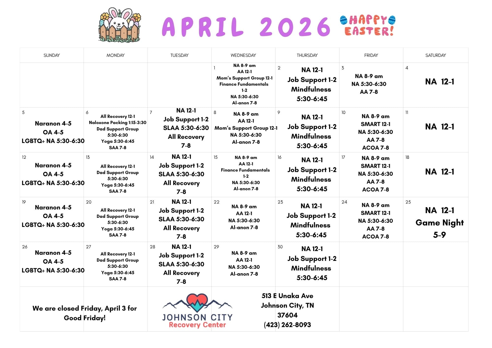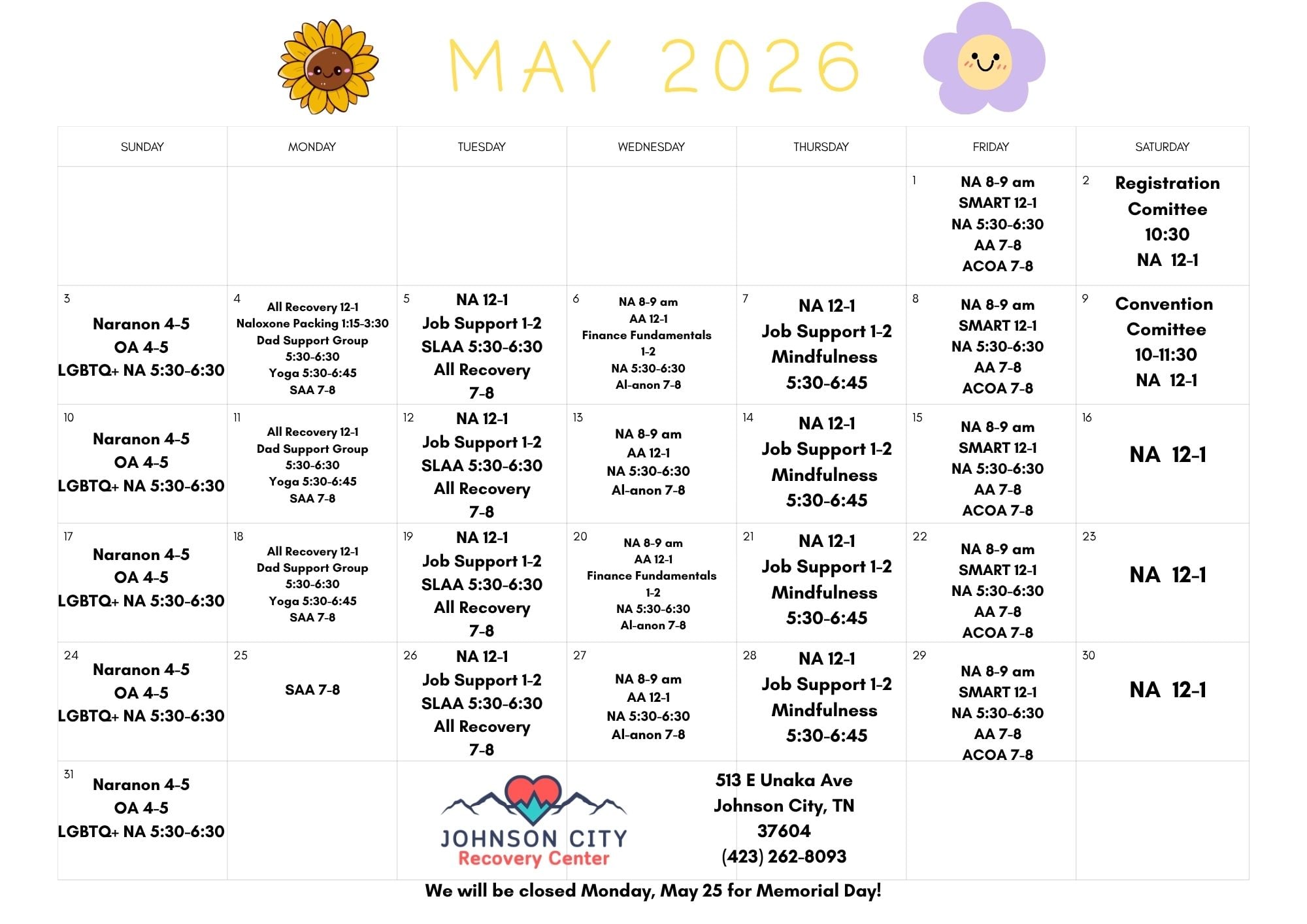 JC Recovery Center Calendar